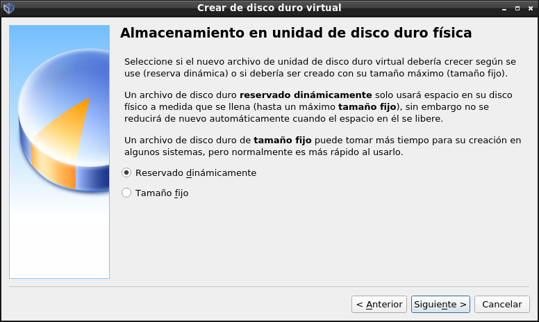 De las opciones que nos da respecto al tamaño del fichero para almacenar el disco, elegiremos que el tamaño crezca dinámicamente (conforme llenamos el disco).