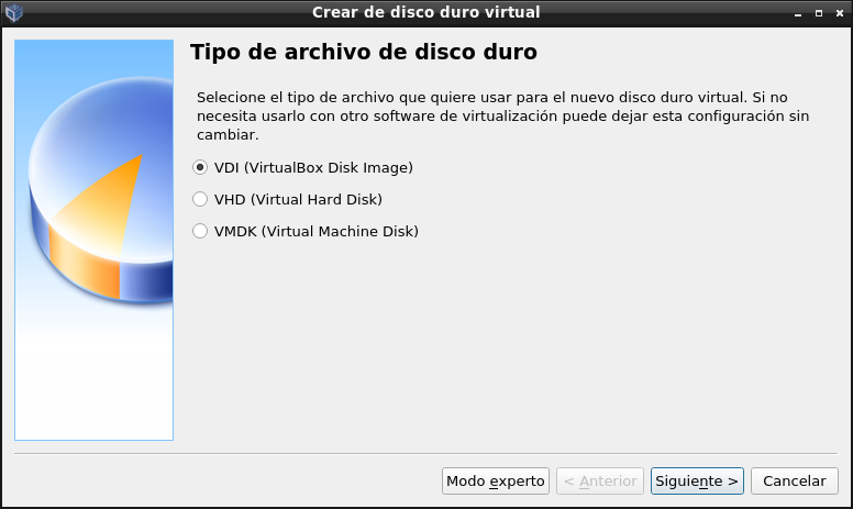 De los tres formatos de archivo para almacenar el disco duro, escogeremos el de Virtual Box, que son archivos con extensión .vdi (virtual disk).