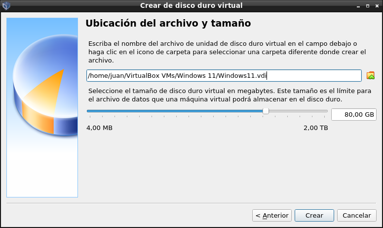 Creamos un disco con formato VirtualBox (.vdi) de 80 gigas, y lo guardamos en la carpeta de las máquinas virtuales. Vamos a llamarlo con el nombre del sistema operativo que instalemos en él.
