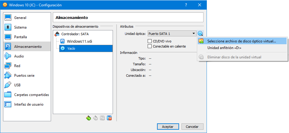 En cuanto al CD-ROM, puede ser el CD-ROM físico del S.O. anfitrión, o una imagen ISO.